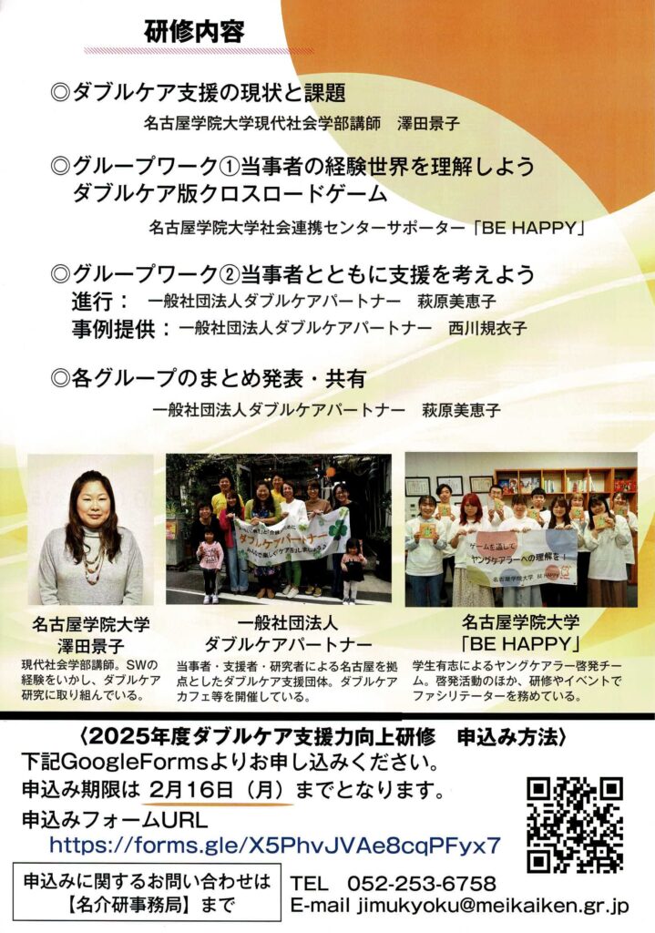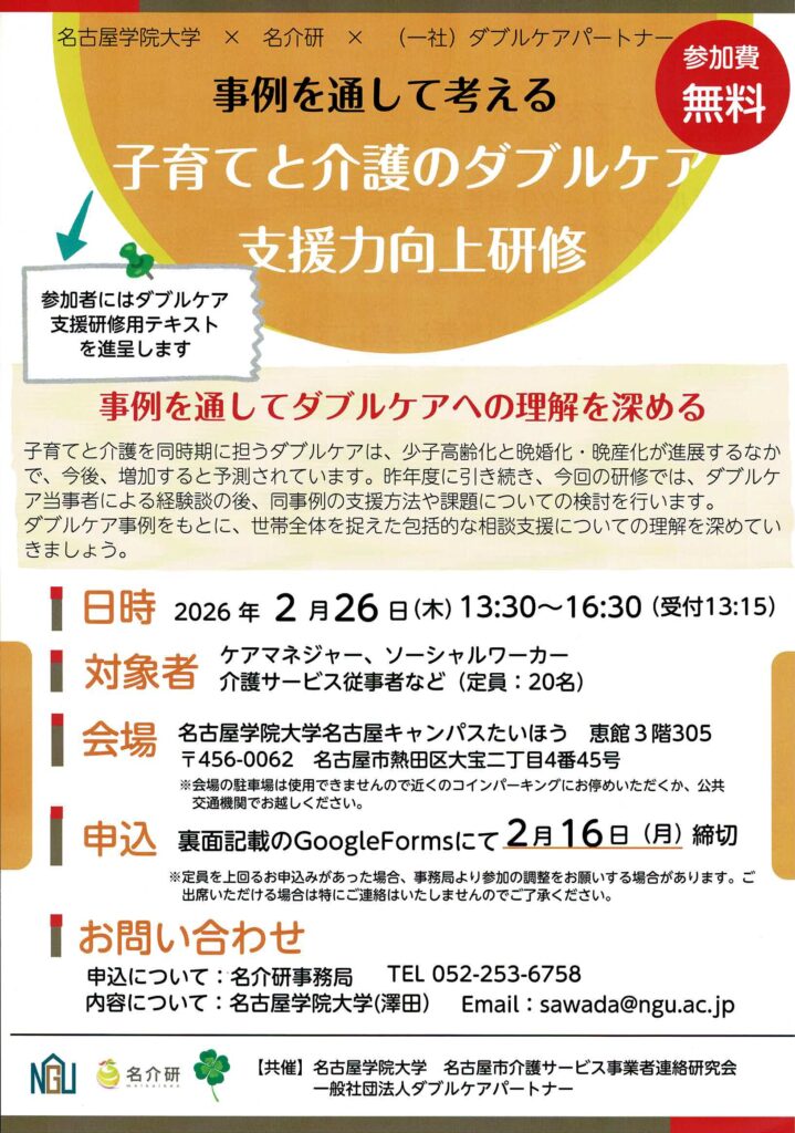 例年開催してきましたダブルケアパートナー・名古屋学院大学・名介研共催のダブルケア支援力向上研修📝